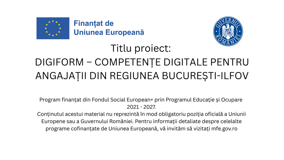 Proiectul DIGIFORM este un exemplu strălucit de utilizare eficientă a resurselor europene pentru dezvoltarea capitalului uman local. DIGIFORM – COMPETENȚE DIGITALE PENTRU ANGAJAȚII DIN REGIUNEA BUCURESTI-ILFOV, proiect finanțat din Fondul Social European+ prin programul Educație si Ocupare 2021-2027 (COD PROIECT: 311837), are ca obiectiv principal creșterea gradului de alfabetizare digitală în rândul angajaților din cea mai dinamică regiune economică a țării. Prin acest mecanism de finanțare, beneficiarii primesc nu doar instruire, ci și materiale didactice și acces la platforme de e-learning moderne, totul fără a plăti nicio taxă.